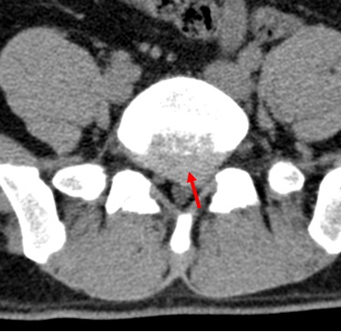 患者腰椎CT显示L5-S1椎间盘突出明显,压迫左侧神经根。