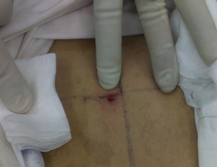 患者男,33岁。因腰痛半年,左腿放射痛二周来诊。入院查体:腰部L5-S1椎间隙压痛明显,并出现向左下肢放射痛。直腿抬高试验20度阳性,加强实验阳性。肌力正常,左足外侧感觉减退。MRI和CT都发现腰椎间盘突出,以L5-S1明显,保守治疗无效。经科室讨论后认为患者有明确手术指征,行微创手术患者恢复快。后于2009年12月2日,由林欣主任主持,潘海涛主任医师、闫家智副主任医师参加,在局麻下行经皮椎间孔镜下椎间盘髓核摘除手术。术后患者疼痛症状消失,第二天能下地活动,术后三天治愈后出院。这是骨科自己实施的第一例椎间孔镜下的椎间盘微创手术,并取得明显效果。