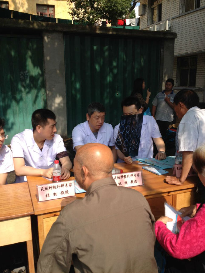 与此同时,神经外科医护人员分为三个小组,分别赴武汉长航医院、云梦县人民医院和大悟县第二人民医院开展义诊活动。武汉长航医院是我院协作医院,我院常年派遣副主任以上医生参与其日常诊疗活动,开展临床及科研合作。在长航医院,高之宪、张建国、贾桂军、隋大立、郭尔安等神经外科专家及王庆珍护士长就颅脑肿瘤、颅脑外伤、功能神经外科、颅脑血管病及神经外科患者术后护理等问题接受患者咨询,共义诊患者300余人次。云梦县和大悟县分别距武汉市约一个小时车程,为最大限度地惠及患者,两组医护人员清晨6点即从武汉出发,开始行程。两家基层医院的义诊活动,吸引了大量当地患者,累计义诊超过300人次。