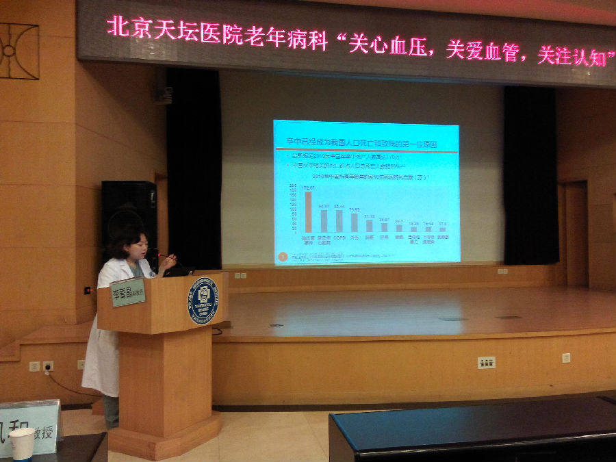 在10月9日的学术活动中,老年病科的杜凤和教授首先从“关心血压”这一主题为切入点,分析了我国目前高血压严峻的流行病学现状及尚需改善的诊治状况,深入讲解了高血压及其导致的相关疾病,介绍了高血压的治疗策略及新进展,并采用生动的病例加深大家的理解。接着,李菁晶副教授从“关爱血管”的角度着手,深刻分析了高血压等血管危险因素损害脑血管、导致脑卒中的病因及发病机制,结合国内外指南和临床循证医学证据讲解了在理想控制血压的同时进行规范、有效降脂治疗的意义、方法及新进展。最后,张巍教授从“关注认知”的层面出发,详细介绍了中国血管性认知障碍的诊断及治疗指南,呼吁同行们在关注脑血管病引起运动、感觉及语言等方面严重功能障碍的同时,同样要高度关注患者认知功能的变化,及早治疗,以期全面提高脑卒中患者的生活质量。