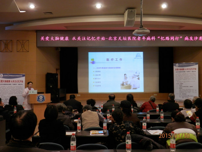 北京天坛医院老年病科于2015年1月30日在我院神经外科研究所二层会议室举办了“忆路同行”病友沙龙。本期沙龙由老年病科张巍主任主持,主题为“关爱大脑健康,从关注记忆开始”,旨在通过举办阿尔茨海默病(AD)诊治知识讲座、发放健康宣传手册及现场义诊等活动,唤起老年朋友关爱大脑健康,尤其要关注记忆,提高对AD的重视,协助家属提高AD患者的生活质量。