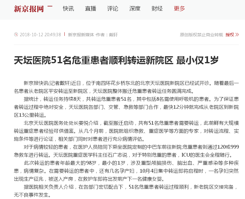 【新京报网】2018-10-12 天坛医院51名危重患者顺利转运新院区 最小仅1岁