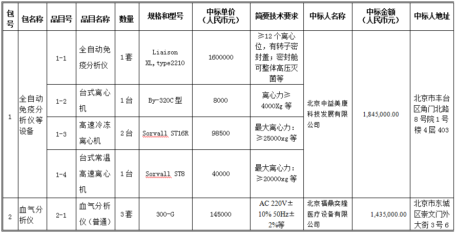 迁建工程医用设备购置-分项15(招标编号:0701-194160080042)中标公告