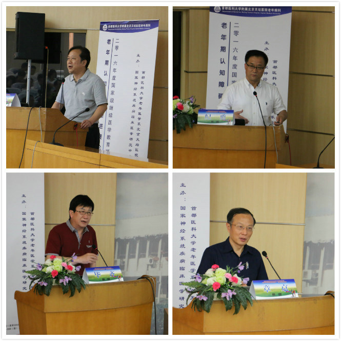中华医学会老年医学分会主任委员于普林教授(左上)、首都医科大学老年医学系主任委员陈彪教授(右上)致辞,中国人民解放军总医院王鲁宁教授(左下)、中华医学会北京老年医学分会主任委员吴青教授(右下)主持会议