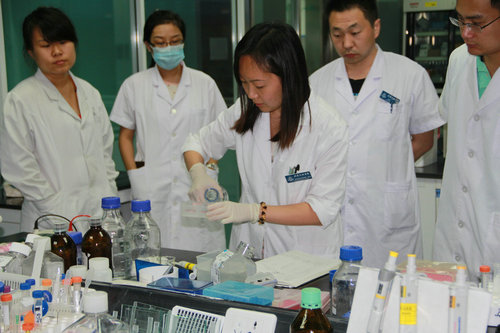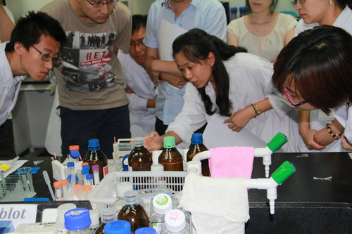 培训班共招收来自北京天坛医院、首都医科大学、北京世纪坛医院、北京垂杨柳医院、天坛普华医院等学员28人。培训班采取小班分组式授课方式,每组9至10人,使每位学员充分参与其中。通过4天的系统培训,学员学到了分子生物学(核酸提取、PCR技术、Western技术)、细胞生物学(细胞培养、流式细胞术)、组织化学(冰冻切片、石蜡切片、HE染色)等相关理论知识和实验技术。