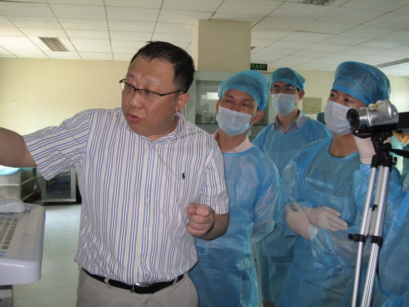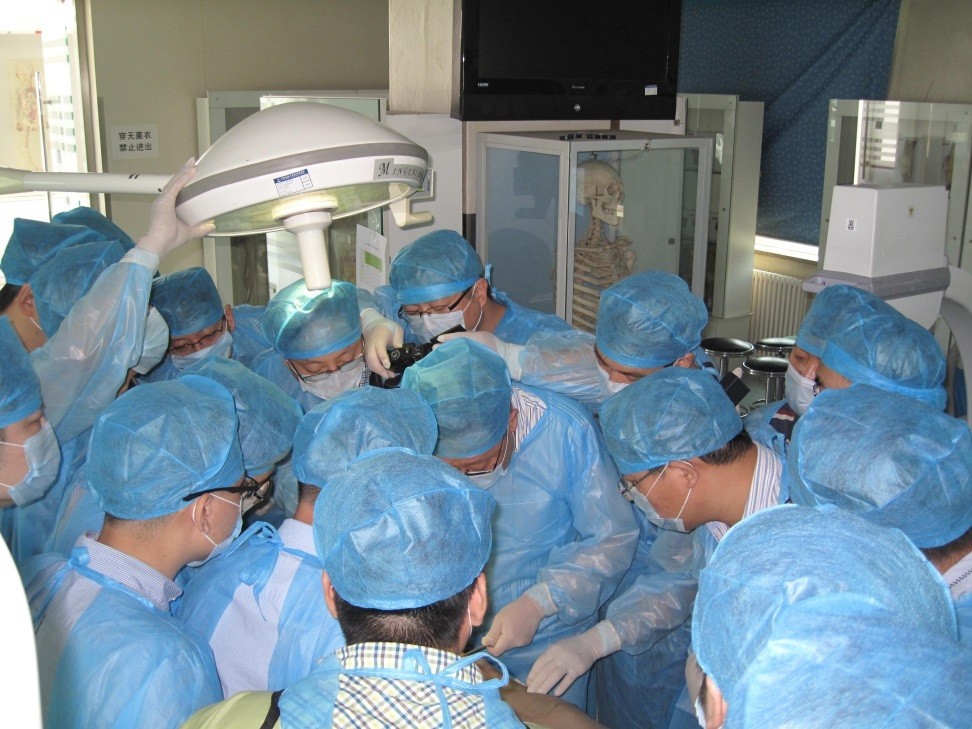 本着务实精神,6月1日进行现场演示及标本操作。利用4具新鲜标本,由刘宝戈主任及德国sola教授分别现场演示,学员自己标本操作,采用手把手教学达到提高TLIF手术操作技巧、掌握TLIF辅助器械等方面知识,避免术中潜在的陷阱及术后并发症之目的,通过实例讨论及实际操作来解答同道应用TLIF曾经历的困惑、缩短此项技术的学习曲线,完成理论与实践之结合。通过2天的学习每位学员均有巨大收获。从开放及微创下TLIF技术入路、固定、减压、融合等各个环节的技术要点、误区、可能出现并发症的原因及处理获得清晰、直观、切实收获。