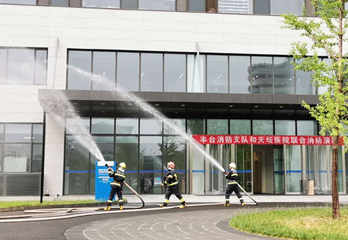 5月12日国家防灾减灾日当天,丰台消防支队和北京天坛医院举行联合消防演练。