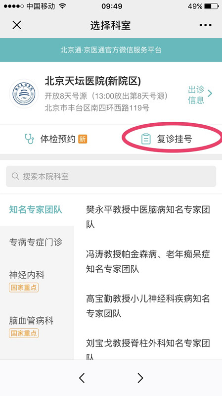 “我是慢性病,就想一直看一个大夫,这样大夫了解我的病情变化,能及时调整治疗方案。” 这是许多患者希望解决的问题。现在,患者只需轻点手机,通过手机“京医通”北京天坛医院主界面上“复诊挂号”选项,按照系统提示登录、绑定医保卡或“京医通”就诊卡后,选择“复诊挂号”就可以看到自己在北京天坛医院的就诊记录,根据记录预约8天内的号源,副主任医师以上的,可以直接“点对点”预约接诊的医生。