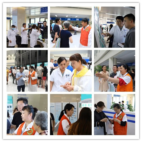 清晨七点半,来自我院各行政部门及离退休党支部的党员志愿者们就来到门诊大厅,为前来就医的患者提供政策宣传、门诊导医、自助机具使用指导等服务。