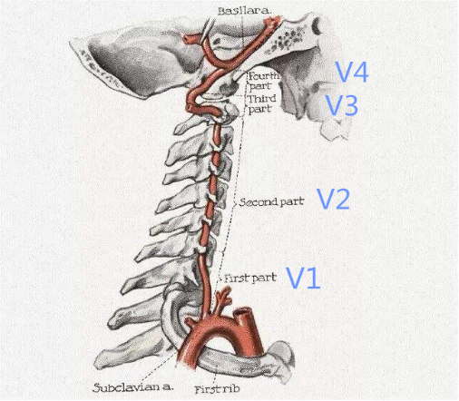 供应人脑血液主要有两套系统,即椎动脉系统和颈动脉系统。椎动脉是供应人脑的重要血管。椎动脉分为四段,V1段(椎动脉的起始段,椎动脉闭塞或狭窄的最常见的部位,也是手术最常见的部位);V2段(此段有骨质遮挡,手术困难,一般不进行手术);V3段(此段解剖困难,手术难度大,却是椎动脉手术的另一常见部位);V4段(颅内段,一般不进行手术)。