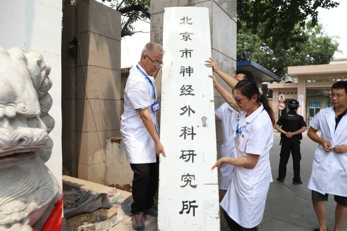 2019年6月26日上午11时09分,在这个记录历史的时刻,院所部分同志代表全体员工,见证了这一简短庄重的摘牌仪式。凝聚着老一辈天坛人精神和历史印记的“北京天坛医院”和“北京市神经外科研究所”牌匾,载入史册。