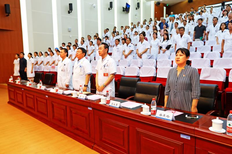 大会在雄壮的国歌声中正式开始,通过重温2018年新院搬迁举行“庆国庆、升国旗”仪式的画面,大家仿佛又回到了2018年在医院党委带领下,全院众志成城,克服一切困难,热火朝天搬家的场景,再次将全场职工的心紧紧凝聚在一起。