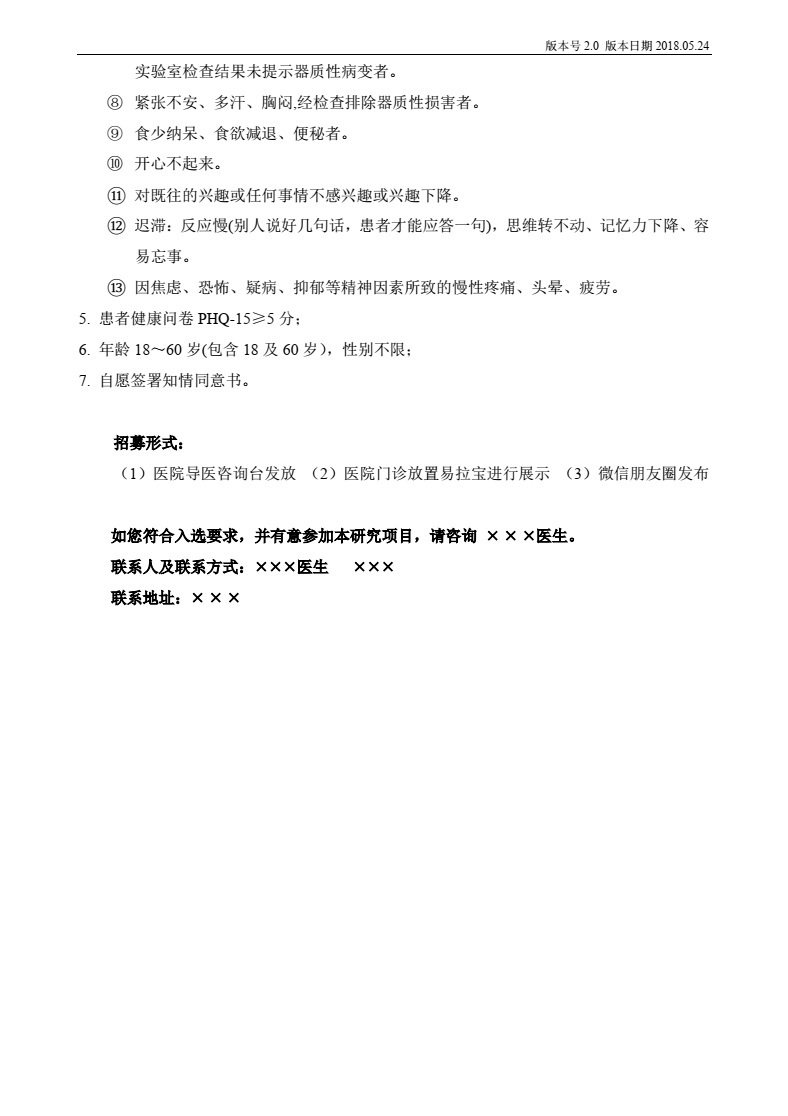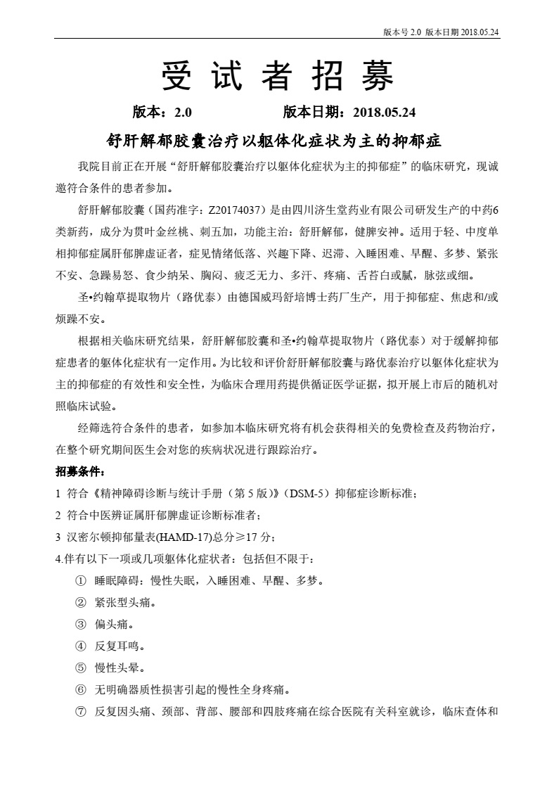 舒肝解郁胶囊治疗以躯体化症状为主的抑郁症受试者招募