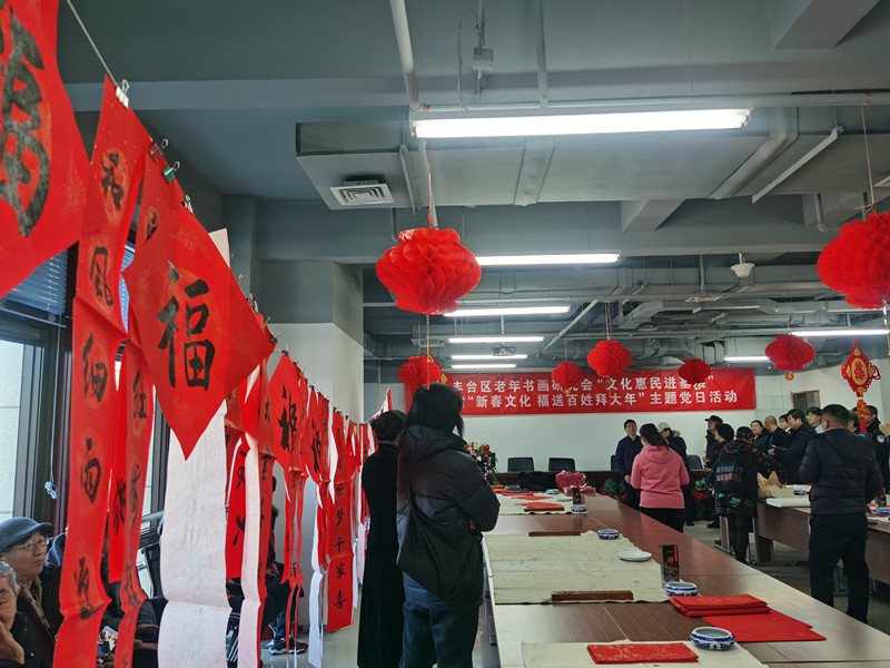 2020年1月8日上午,北京天坛医院行政党支部一行来到丰台区老年书画研究会“文化惠民进基层”暨樊家村“新春文化 福送百姓拜大年”主题党日活动现场。活动现场陈列了丰台区书画爱好者的百余幅春节对联和福字,一幅幅笔力遒劲的书法作品映入眼帘,饱含着文艺志愿者对社区居民的浓浓深情。丰台区老年书画研究会数位书法家为广大党员干部、群众现场作画,书写诗词,并赠送,大家对书法作品赞不绝口,并现场拍照留念。
