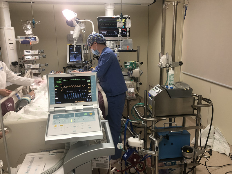 “介入手术成功开通了“罪犯”冠脉血管、恢复心脏血运,但患者冠状动脉左主干闭塞后引起大面积心肌梗死,出现心脏泵功能衰竭。”北京天坛医院心血管外科主任徐东说,“目前药物支持,IABP机械辅助心脏,不能完全控制住病情。 最后一线希望,就是给病人置放ECMO辅助循环,让衰竭的心脏‘休养生息’‘渡过难关’。”