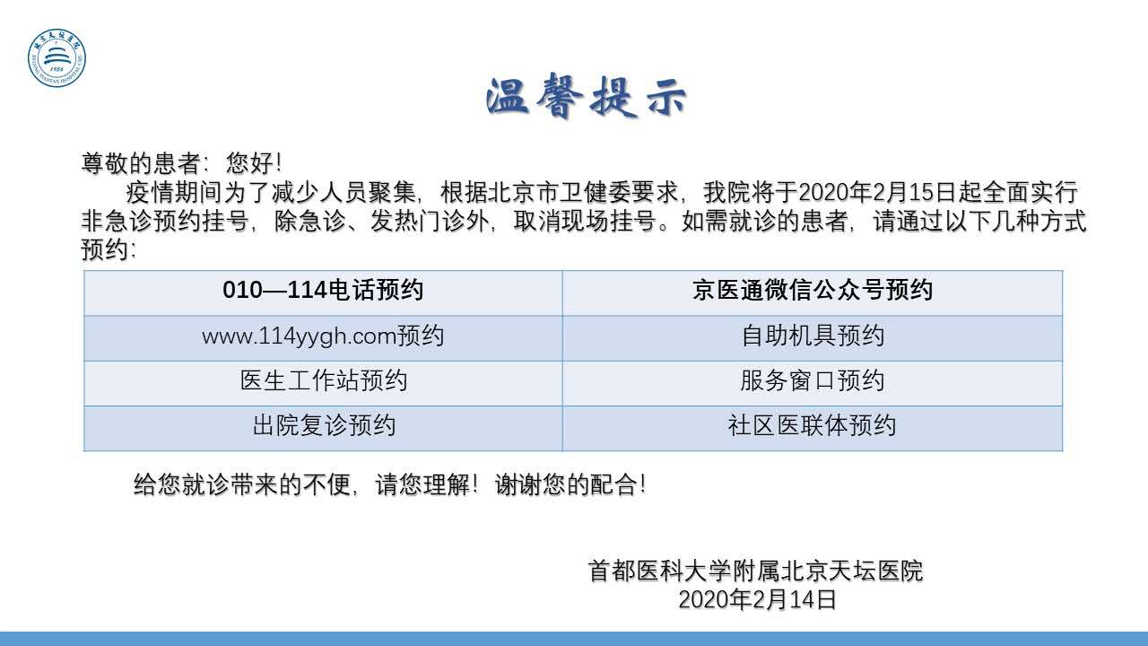 疫情期间为了减少人员聚集,根据北京市卫健委要求,我院将于2020年2月15日起全面实行非急诊预约挂号,除急诊、发热门诊外,取消现场挂号。如需就诊的患者,请通过以下几种方式预约: