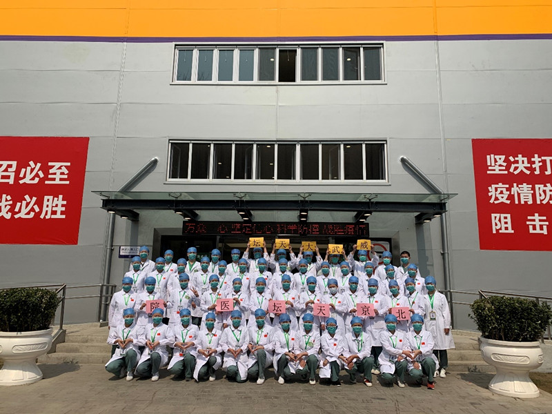 “威武大天坛,我们一定赢!加油!”在小汤山医院,来自北京天坛医院的54名医疗队员整齐地喊出口号。“我们来到小汤山医院工作已经两周,大家一切都好。为了完成任务,每位医疗队员都付出了很多。”医疗队队长刘晓楠说,趁着难得的休整时间,医疗队组织队员们短时间地集体拍照。