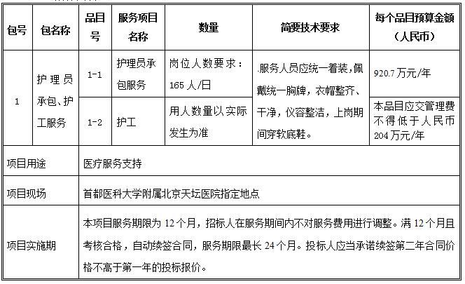 中技国际招标有限公司(以下简称“采购代理机构”)受首都医科大学附属北京天坛医院(以下简称“采购人”)委托,就利用其财政性资金的“北京天坛医院医疗服务支持(护理员承包、护工)服务项目”进行国内公开招标。现邀请合格投标人就下列需求提交密封投标。