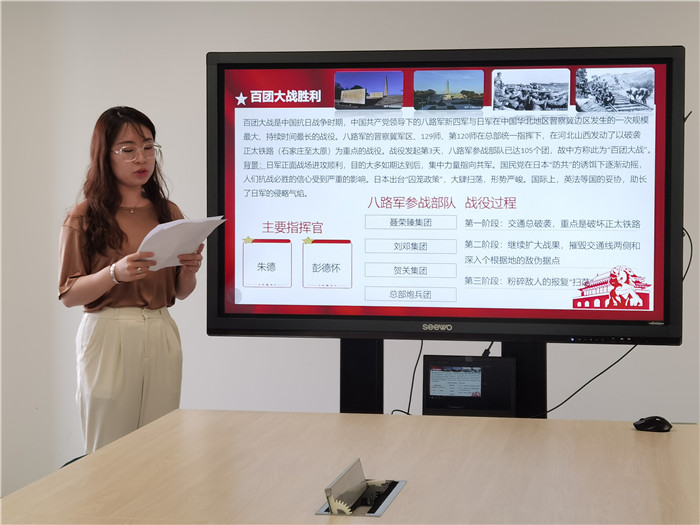 我们以党史故事朗诵会的形式召开了本次主题党日活动,给大家提供一个学习交流和学习成果展示的平台。新入职职工王春阳同志的《南昌城头的枪声》讲述了1927年8月1日南昌起义那段波澜壮阔的历史;共青团员姜春飒同志的《百团大战胜利》展示了抗日战争中我军参加兵力最多、规模最大、时间最长、战果最丰富的一次战役;青年党员安海婷同志的《鲜为人知 “最棒车间主任”焦裕禄》呈现了焦裕禄——这位感动一代又一代国人的县委书记榜样在大连起重机器厂担任车间代培主任的600多天里的点点滴滴,暴雨倾盆时带伤防洪抢险、脏活累活带头干、从工业“门外汉”成长为行家里手,他一切为了人民,人民从未忘记他。除了个人朗诵,在此次活动中,我们还聆听了由刘潜同志原创,刘红梅、李莹、刘潜等同志集体朗诵的《华夏战疫赋》,再现了2020年伊始新冠疫情肆虐华夏大地举国同心共抗疫情的情景。