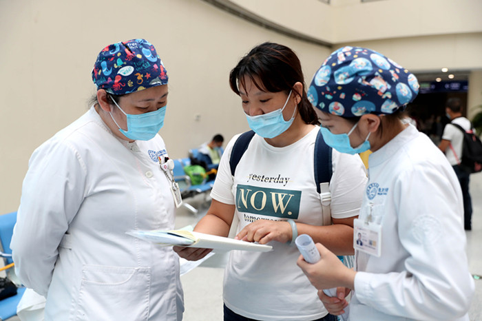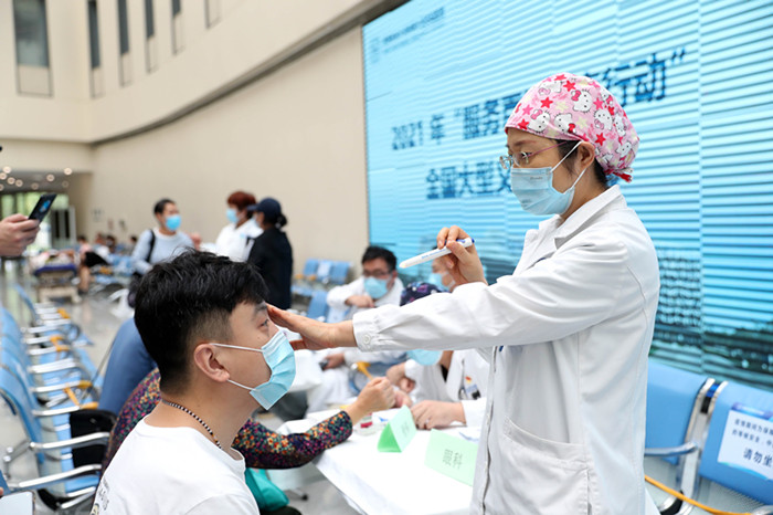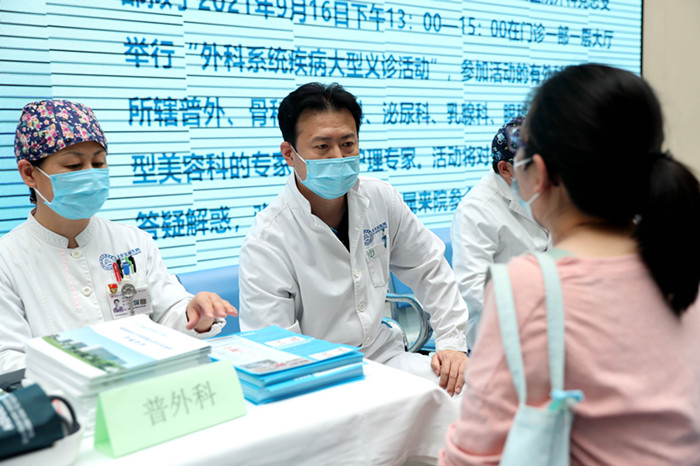 学党史,践行动。2021年9月16日下午,北京天坛医院外科党总支部在门诊大厅组织举办了“服务百姓健康行动”大型义诊活动。活动中,普外科、骨科、乳腺科、泌尿外科、胸科、血管外科、眼科以及护理学等各个领域的专家齐聚义诊现场,为前来的群众进行了病症答疑、健康宣讲、知识手册发放等义诊服务。医院党委书记管仲军也在百忙之中出现在活动现场,指导义诊活动的开展。外科党总支书记王丕琳、副书记亢卫波,支部委员王辉、杨皛皛、杨柳参加了此次义诊活动。活动中,普外科冯国勋、闫鸣等专家除了为大家答疑,还普及了微创手术治疗肥胖症、糖尿病等科普知识。骨科王磊、亢卫波等专家解答了群众们关于慢性骨病、关节病等方面的各种疑问。护理专家苏娅丽、刘翠芳、马红艳等就乳腺癌术后上肢水肿、造瘘口护理等专业性问题为前来咨询的患者提供了耐心解答和详尽的生活指导。眼科副主任杨柳为前来咨询的数位老人解答了白内障等老年眼科常见疾病相关的疑问。乳腺科主任王丕琳除了为广大群众提供义诊服务外,还在现场接待了多名闻讯前来的乳腺癌老病友,大家欢聚一堂,义诊现场甚至变成了“粉丝见面会”!乳腺科、血管外科、胸科等科室均在展台展示了科室公众号二维码,鼓励大家扫码关注科普公众号,提供线上医疗、护理服务,传播科普知识!