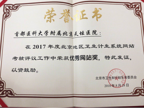 9月20日下午,北京市卫生计生系统网站考核评议工作总结会召开,会上公布了2017年度北京地区卫生计生行业网站考评结果,我院网站在92家三级医疗机构网站评测中,以高出平均分32分的92.3分获“优秀网站奖”。这已是天坛医院网站连续第8年在考评中获得嘉奖。