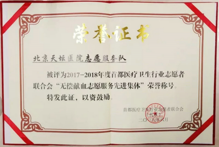 2018年6月12日,首都医疗卫生行业志愿者联合会在北京市红十字血液中心召开了首都医疗卫生行业无偿献血志愿服务培训班暨表彰大会,会议对无偿献血工作优秀组织进行了表彰,我院志愿服务队被评为2017-2018年度首都医疗卫生行业志愿者联合会“无偿献血志愿服务先进集体”。