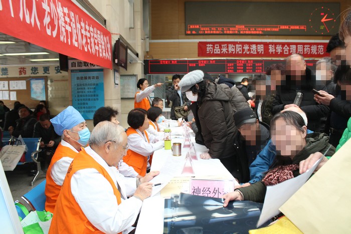 急于求医的病人还未等老专家们就坐,就自觉地一队队排好,家属多的分头排两三个队。老专家们也是医者仁心,马上开始接待病人。骨外科邢主任面前是一位老年女患者,疾病长期的折磨使得老人越说越激动,邢主任一面安慰老人,一面仔细地看片子,并给出自己的建议;神经内科杨主任正准备接待下一位病人时,刚刚咨询完的病人又认真地问:“大夫,脑肿瘤不遗传吧?”杨主任说不会直接遗传的,听到杨主任的回答后,病人不放心地又连着问:“真的不会吗?真的不会吗?”神经外科老专家朱主任已经76岁,他面前的队伍最长,两个小时的义诊朱主任一口水都顾不上喝,一个病人接着一个病人,义诊结束时还有十几位病人不肯离开,朱主任一边看一边跟大家说:“别着急,我一定给大家都看。”团委派来的志愿者帮助维持秩序的同时,也进行了健康宣教,并发放了部分科室的专业宣传品。