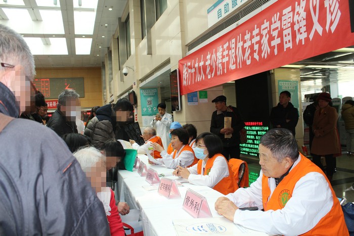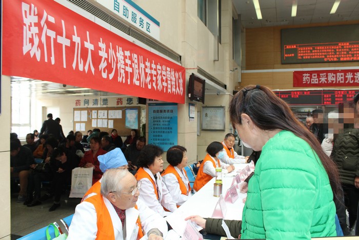 2018年3月5日下午,来自神经外科、神经内科、老年病科、呼吸内科、骨外科、泌尿外科、眼科和临床营养科的8位退休老专家在我院门诊大厅参加了离退办组织的践行十九大、 老少携手退休老专家学雷锋义诊活动。