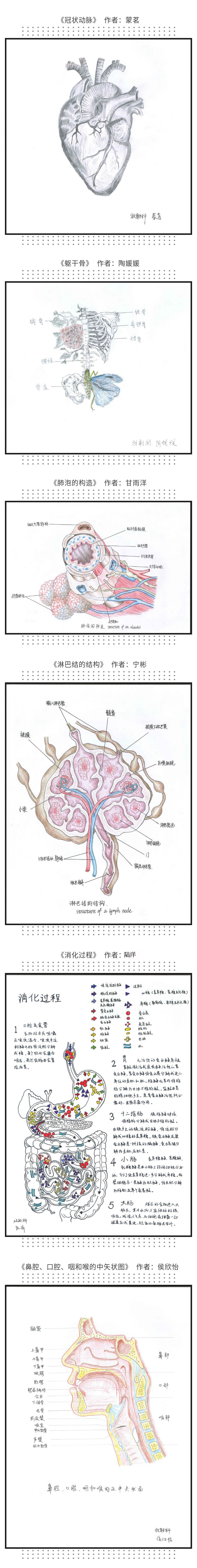 今年的解剖图绘制准确、图形美观,惟妙惟肖的头骨、形神兼备的消化过程、线条分明的肺泡构造,无不说明大家对本职工作的精益求精和热爱。