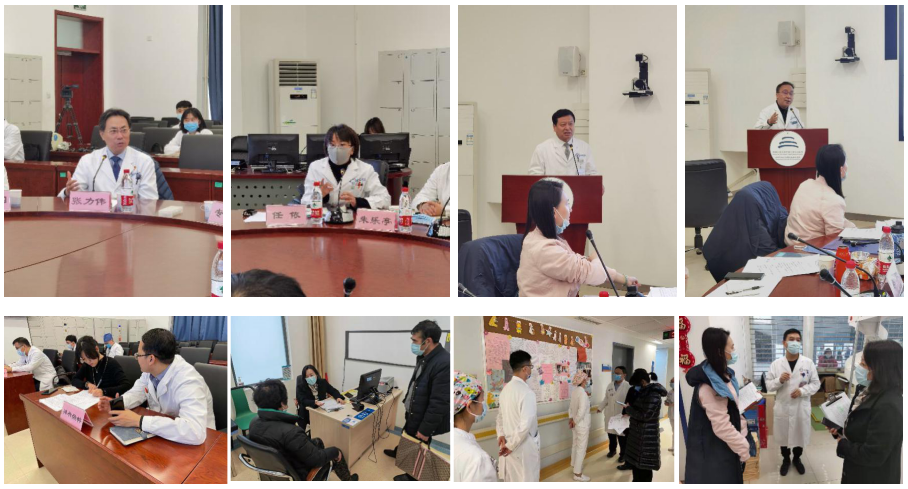 张建国、刘爱华、朱乐亭对科室人文工作情况进行汇报,汇报内容包含科室基本情况、人文科室建设情况、经验亮点等。部分专家对病房及门诊区域进行了现场实地检查。专家们对病房氛围进行检查,查看健康教育宣传栏,医患沟通墙,并与医护人员及病人进行访谈等。部分专家对三个科室的文件材料进行现场查验。最后,所有专家进行结果汇总合议,并对三个科室进行集中反馈。
