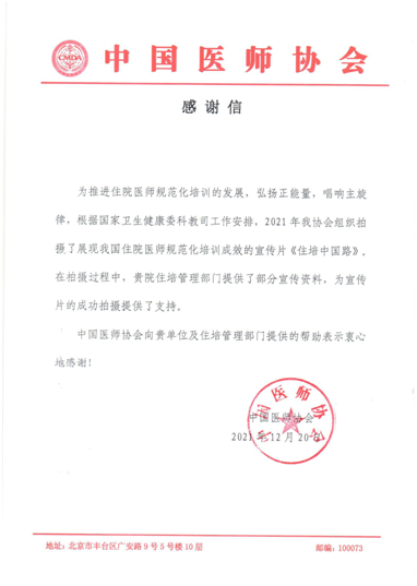 为推进住院医师规范化培训的发展,弘扬正能量,唱响主旋律,我院协助中国医师协会拍摄展现我国住院医师规范化培训成效的宣传片《住培中国路》,中国医师协会发来感谢信,向我院及医院教育处提供的帮助予以感谢。