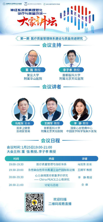 新年伊始,国家神经系统疾病医疗质量控制中心(以下简称“国家质控中心”)联合中国卒中学会医疗质量管理与促进分会于2022年1月25日成功举办主题为“医疗质量管理体系建设与质量改进研究”的神经系统疾病规范化诊疗与质量改进大家讲坛第一期线上讲座。此次线上讲座邀请了国家卫生健康委医政医管局医疗质量与评价处高嗣法,首都医科大学附属北京天坛医院院长王拥军,国家心血管病中心、中国医学科学院阜外医院李静作为演讲嘉宾。