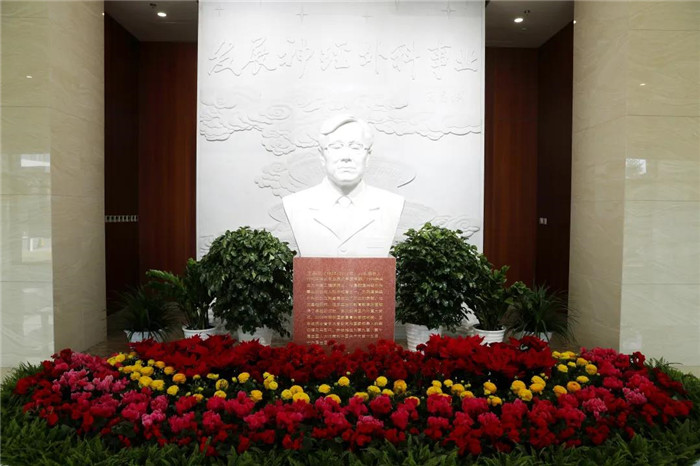 图|鲜花掩映中的王忠诚院士塑像。2022年3月4日,北京天坛医院党委追授王忠诚院士“终身成就奖”。