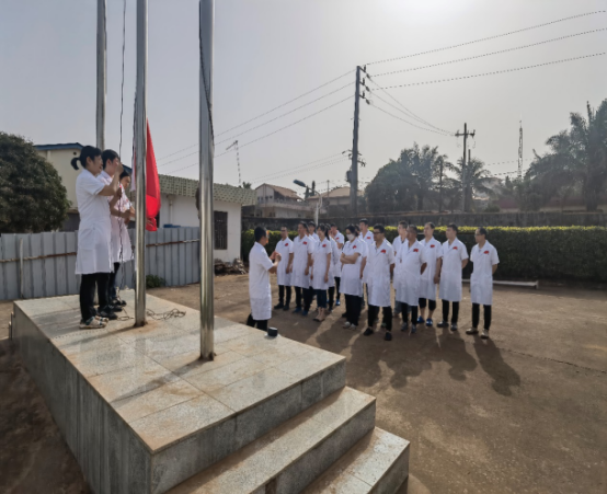 虽然条件相对简单,但升旗仪式简单而庄重。全体医疗队员身穿胸前绣有中国国旗的白衣,集体肃立,向国旗行注目礼。