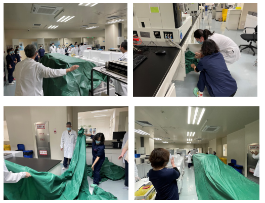 演练主要模拟实验诊断中心二部顶棚漏水和实验室发生火情后逃生等情节。演练要求所有人员了解防水布放置位置,在遭遇突然漏水时,就近准确使用防水布保护试验设备,并第一时间上报处理;由于实验诊断中心位于地下,在遭遇火情时,要求全部人员能够准确找到就近逃生出口,第一时间疏散。