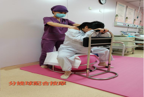(5)运用分娩球:分娩球是一个柔和具有弹性的球体。产妇可骑坐在分娩球上休息;可由旁人指导并协助产妇在分娩球上缓慢弹坐,或者缓慢旋转,对盆底肌肉进行按摩,缓解会阴部和腰骶部的疼痛;也可坐在球上配合深漫的呼吸规律性活动髋部;或者跪伏在分娩球上改变体位和呼吸方式,并依靠球体对皮肤的弹性接触缓解疼痛。