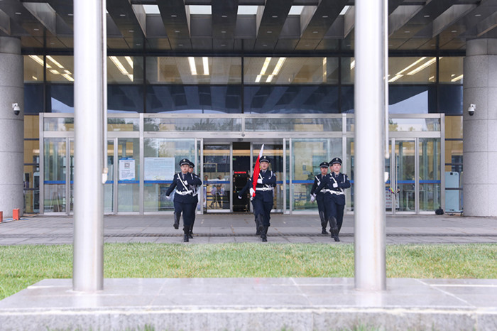 7时30分许,由医院安保人员组成的护卫队正步护卫国旗来到旗杆下,雄壮的国歌声中,鲜艳的五星红旗冉冉升起,高高飘扬,现场所有人员庄严肃立,向国旗行注目礼。
