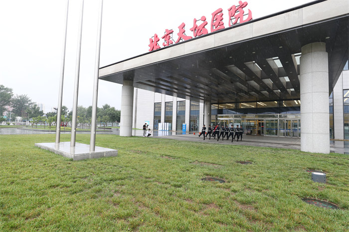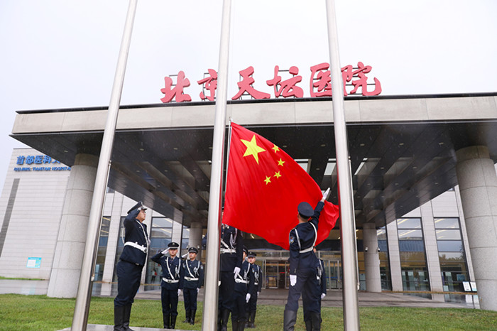 蒙蒙细雨中,升旗队伍早早在医院南门广场集合。门诊服务大厅楼体上,王忠诚院士手写的“北京天坛医院”六个红色大字,经过雨水洗刷,更显神采奕奕。