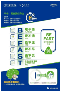 “BE FAST”口诀是中国卒中学会在2021年“世界卒中日”提出的卒中早期识别口诀。“BE FAST”的中文意思是“要快”,也充分体现的脑卒中救治的时效性、急迫性。
