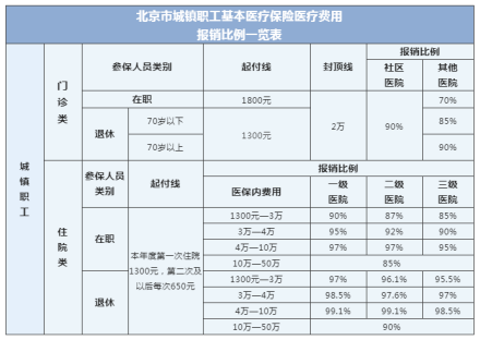 目前,北京市在职职工医院门诊报销比例达到70%以上,退休人员达到85%以上,社区卫生机构报销比例均为90%,门诊封顶线为2万元。北京市在职职工住院报销比例在85%以上,退休人员住院报销比例在90%以上,最高可达99.1%,住院封顶线为50万元。