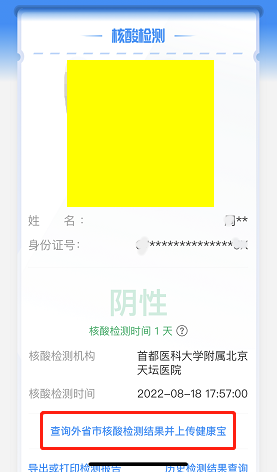 如进京前已完成核酸检测,但“北京健康宝”中【本人健康宝自查询】无法获取,需返回首页后,点击【核酸疫苗服务查询】-【查询外省市核酸检测结果并上传健康宝】更新后,再进入【本人健康报自查询】,更新最近的核酸检测结果和时间。