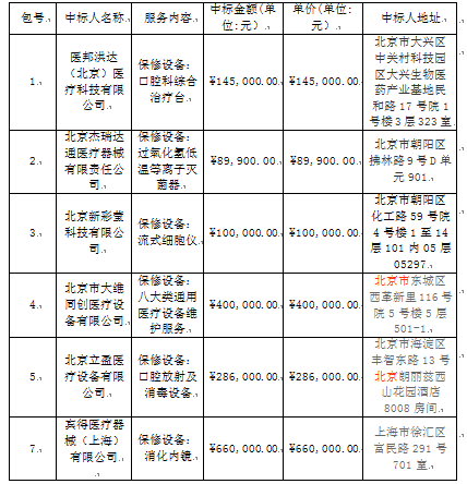 北京天坛医院其他科室医疗设备保修服务中标公告