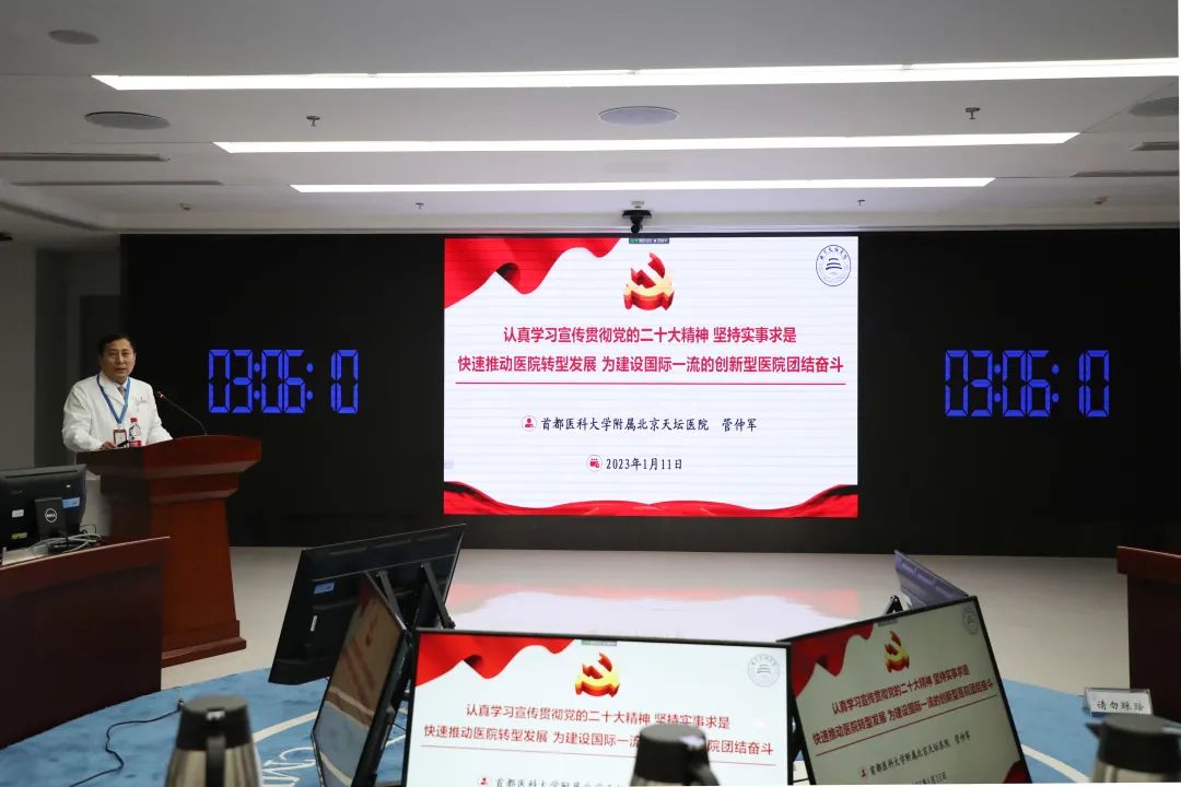 为深入学习宣传贯彻党的二十大精神,引导全院广大党员干部职工真正把党的二十大精神转化为推动医院高质量发展、转型发展的不竭动力。近日,首都医科大学附属北京天坛医院组织党的二十大精神宣讲辅导。党委书记管仲军作了题为“认真学习宣传贯彻党的二十大精神,坚持实事求是,快速推动医院转型发展,为建设国际一流的创新型医院团结奋斗”的辅导报告。会议采取现场宣讲、网络会议转播的方式进行。赵继宗院士、全体院领导、医院党委委员、纪委委员、党务职能科室负责人等在主会场参会。医院各科室(所、中心)负责人、各党(总)支部书记、人大代表和政协委员代表、统战人士代表、各科护士长及病区护士长、工会干部、共青团干部等,通过网络会议参加学习。