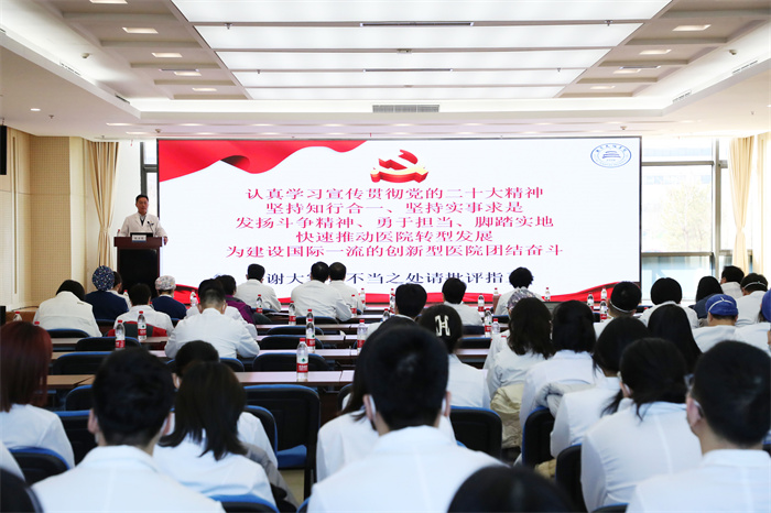 管书记的报告围绕五个方面展开,分别是:充分认识学习宣传贯彻党的二十大精神的重大意义;全面系统学习领会、宣传贯彻党的二十大精神;突出重点抓住关键、牢牢把握党的二十大精神的精髓实质;学习宣传贯彻党的二十大精神,要结合自己的思想和工作实际;坚持知行合一、实事求是,快速推动医院转型发展,为建设国际一流的创新型医院团结奋斗。