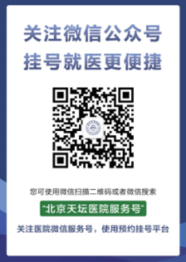 您可以扫描下方二维码,或在微信公众号中搜索“北京天坛医院服务号”,关注我院微信服务号进行挂号。