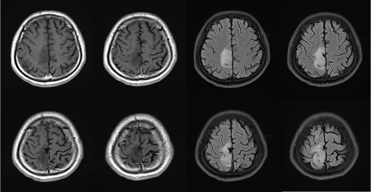 今年32岁的王先生在2018年因为癫痫发作,发现右侧额顶叶占位病变,因为肿瘤累及运动功能区,当地医院进行了肿瘤部分切除。术后病理诊断为弥漫型星形细胞瘤(WHOII级,IDH突变型)。手术后,患者出现左下肢活动受限,偶有癫痫发作。2022年10月开始,王先生癫痫发作情况有所加重,在当地检查发现肿瘤复发,今年,他来到北京天坛医院神经外科就诊。
