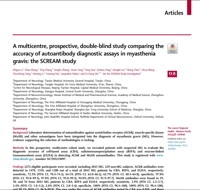 为指导临床医生选择最佳实验室诊断方法,施福东团队完成一项全国多中心、前瞻性和双盲研究(The Specificity, Sensitivity and Clinical Correlation of CBA, RIPA and ELISA Assay in Detecting AChR and MuSK-IgG, NCT05219097 “SCREAM”研究),来自全国九家神经免疫中心的2043例患者入组,研究结果证实了自研的基于细胞的抗体检测新技术在诊断可靠性方面优于放射免疫等诊断技术,产生了重症肌无力全球首个I级方法学推荐证据,对其它神经免疫病抗体检测及临床诊断也有重要参考价值。2023年7月20日,这项成果发表在《柳叶刀-区域健康(西太平洋)》(The Lancet Regional Health - Western Pacific)。