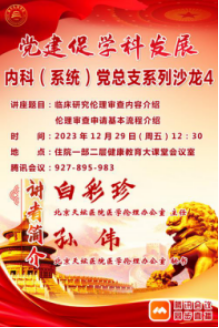 为进一步增强内科(系统)党总支的创造力和凝聚力,内科(系统)党总支于12月29日举办第四期“党建促学科发展系列沙龙”活动。此次沙龙邀请了北京天坛医院医学伦理办公室主任白彩珍孙伟老师,分别就《临床研究伦理审查内容介绍》和《伦理审查申请基本流程介绍》进行了精彩讲座。