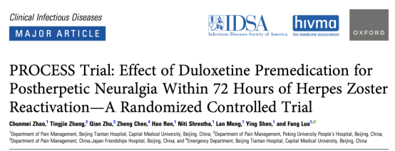 首都医科大学附属北京天坛医院疼痛科罗芳教授带领的科研团队近期于国际著名杂志Clinical Infectious Diseases(中科院一区,2022年影响因子:11.8)在线发表题目为“PROCESS Trial: Effect of Duloxetine Premedication for Postherpetic Neuralgia Within 72 Hours of Herpes Zoster Reactivation—A Randomized Controlled Trial”的科研论文。该研究主要探讨预防性使用经典抗焦虑抑郁药物度洛西汀是否可以预防带状疱疹后神经痛的发生。