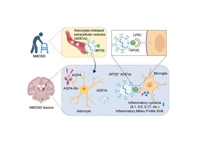 金薇娜、施福东教授课题组最新研究发现NMSOD患者血浆星形胶质细胞来源的细胞外囊泡(ADEVs),通过载脂蛋白E (APOE)与小胶质细胞之间的相互作用机制。研究团队从抗AQP4 抗体阳性NMOSD患者外周血中提取ADEVs,发现患者源性的ADEVs可显著减少NMOSD动物模型的颅内病灶。进一步的蛋白组学分析提示NMOSD患者ADEVs中载脂蛋白E(APOE)显著增加。单细胞测序结合基因敲降实验阐明在NMOSD小鼠模型中,APOE可以通过低密度脂蛋白受体相关蛋白1(LRP1)抑制病灶周围小胶质细胞促炎表型和功能。进一步,课题组应用LRP1受体结合片段APOE130-149肽段,证实APOE130-149肽段可显著减轻NMOSD小鼠的星形胶质细胞丢失、髓鞘脱失和全脑炎症。这一结果在APOE基因敲除小鼠中也得到了验证。上述结果提示ADEVs的保护作用依赖于其高度富集的APOE,因此APOE - ADEVs可能是减轻NMOSD患者脱髓鞘损伤的潜在干预手段。
